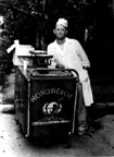 Zev selling Ice Cream in Beregovo. Everyone loves the ice cream man. According to those we interviewed, Zev even came out to sell ice cream in the rain. The only difference was he brought out an umbrella to keep dry. The children all loved Zev because he would allow them to have ice cream even if they had no money--as long as they promised to bring the money the next day. The word on the cart translates to "Ice Cream."